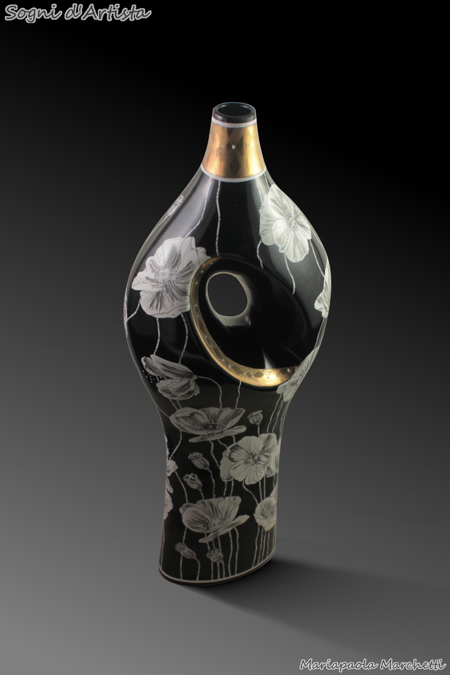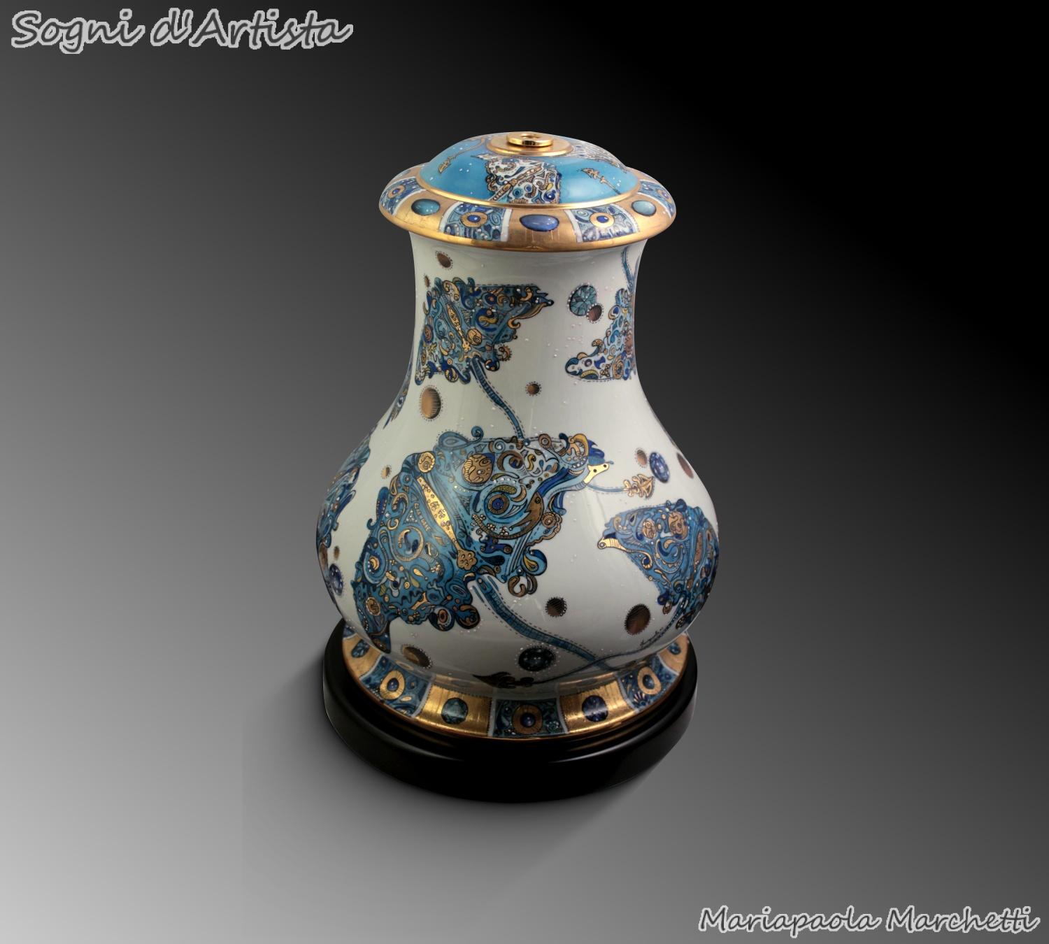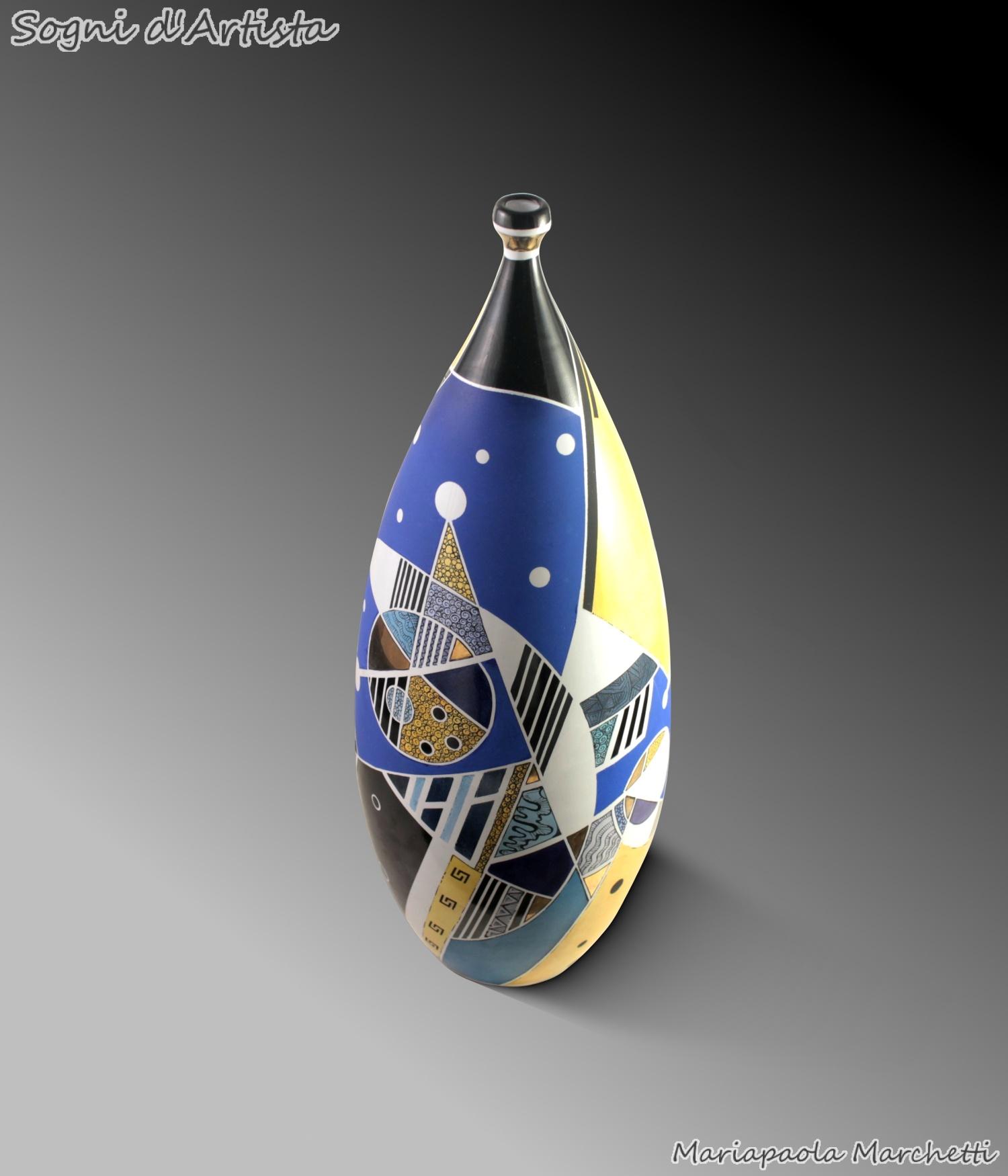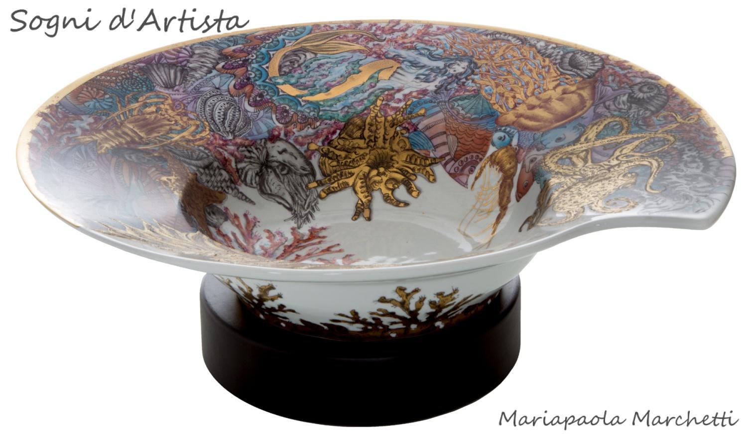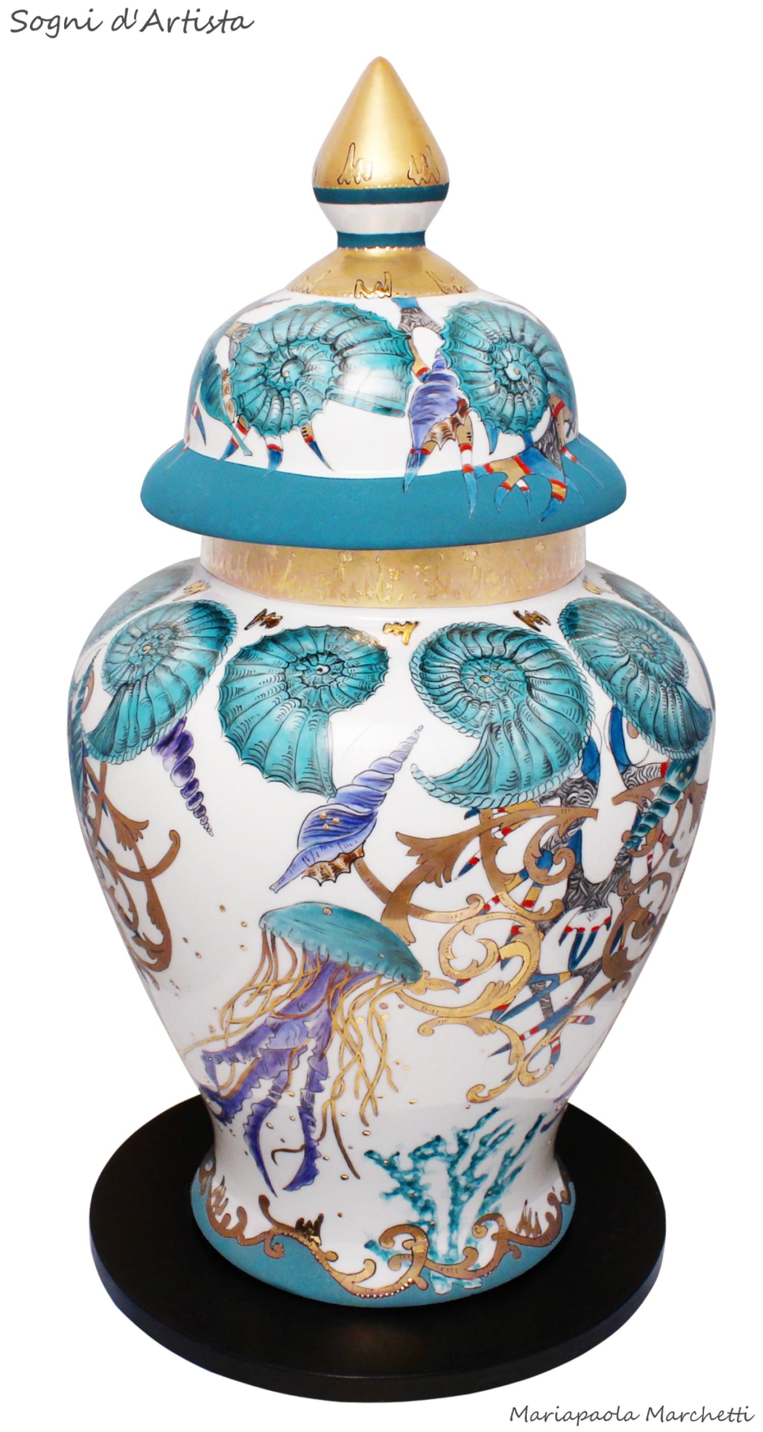 This is Mariapaola's masterpiece. The work shows a musical instrument that goes in a spiral along a big vase. The instrument is decorated with many sea-related images (seashells, mermaids, and so on). This work symbolizes the link between music and the sea.