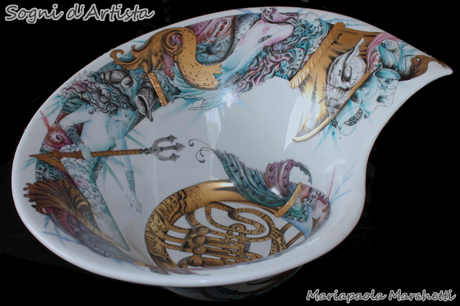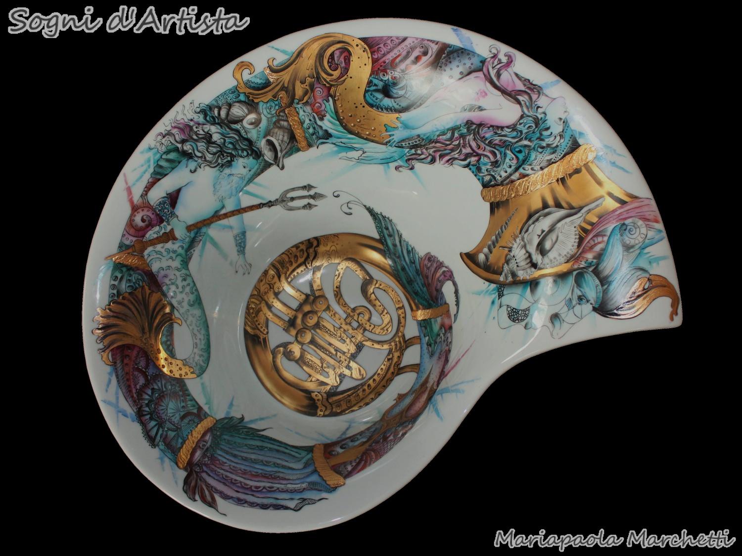 This is Mariapaola's masterpiece. The work shows a musical instrument that goes in a spiral along a big vase. The instrument is decorated with many sea-related images (seashells, mermaids, and so on). This work symbolizes the link between music and the sea.